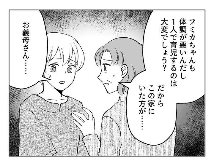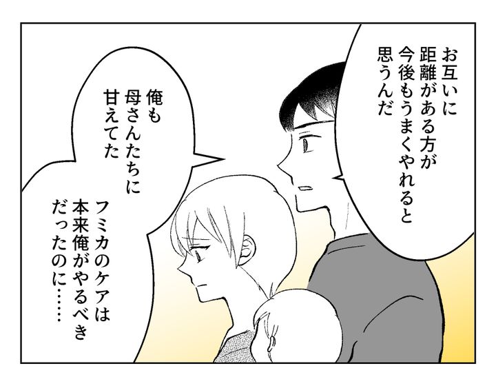 おや? 前回引き止めたい様子だったので、別居することに対してもっと頑ななのかと思いきや……義両親、案外すんなりと別居の提案を受け入れてくれました。嫌いで離れるという結論になったのでないとわかったのはもちろんですが、もしかしたらフミカさんが「私のせいでお義父さんたちも生活スタイルを変えなくちゃいけない」と言ったことにも、何か思うことがあったのかもしれません。