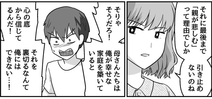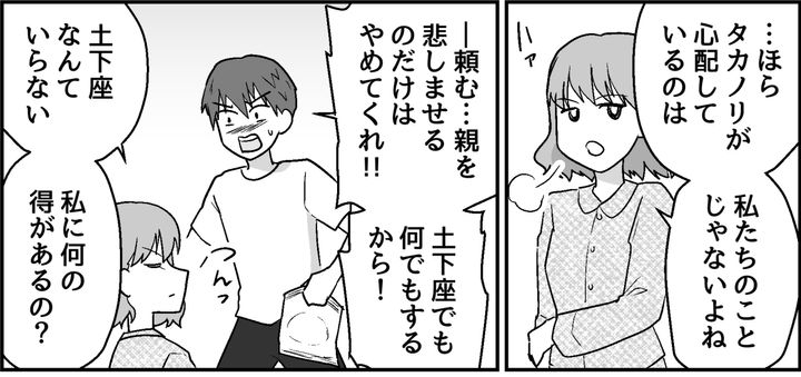 エミカは軽蔑するような目で俺を見てきた。エミカの言うとおり、俺が怖いのは親を悲しませること、親の期待を裏切ることだ。俺のここまでの人生はすべて、親孝行のために成り立っている。だからこそ離婚なんかされたら困るのに……!