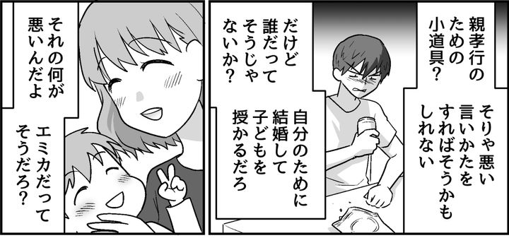 俺は必死で懇願したが、エミカの耳には届かなかった。エミカは「私と子どもたちは親孝行のための小道具だったのね」と言っていた。けれど目的のために結婚して子どもを授かるのはみな同じだろう。そんなに責められることなのか……?