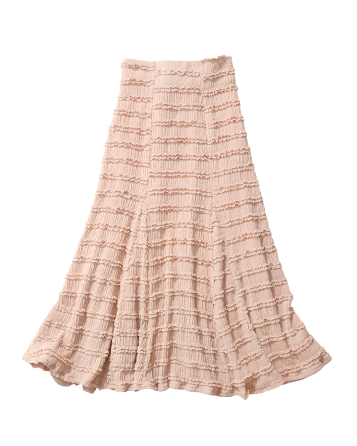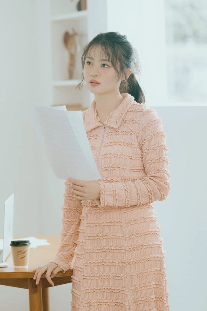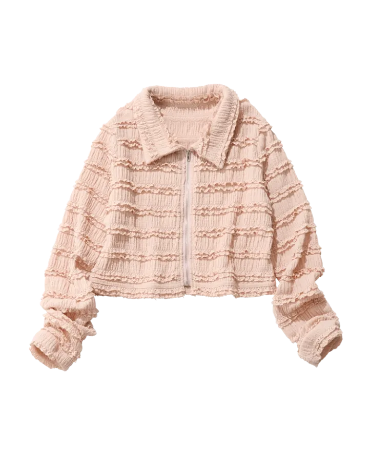可愛さと品のよさを備えたピンクのセットアップ。全体にあしらわれたフリルが、女性らしさを加速。ガーリーもキレイめも◎。