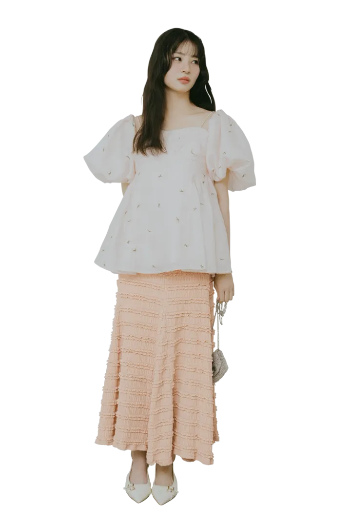 スカート(ジップブラウスとスカートのセット)は着回し。パフスリーブトップス 14,960円/RANDA バッグ 35,200円/ANTEPRIMA/WIREBAG(ANTEPRIMA JAPAN)ベルトつきパンプス 14,300円/rienda(バロックジャパンリミテッド)