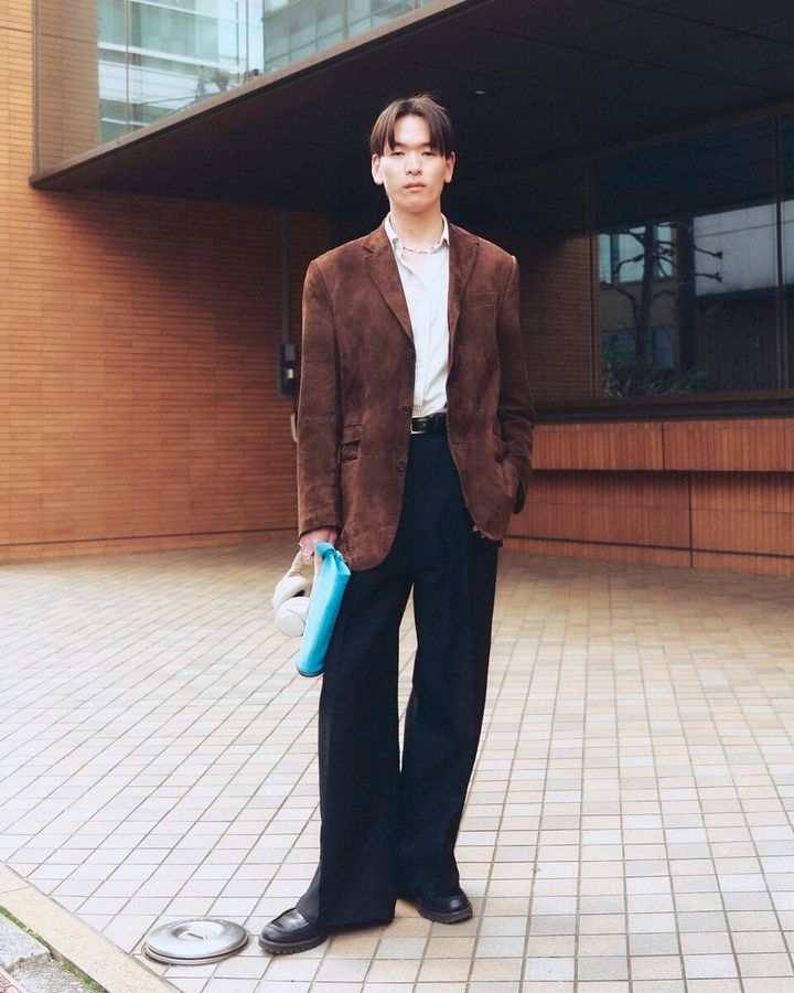 今日の着こなしポイント:クラシックだけど、色気のある雰囲気を全体で出せるように意識しました。その中でライトブルーのバッグを差し色にすることで、色気だけでなく、ファッション感を表現しました。
