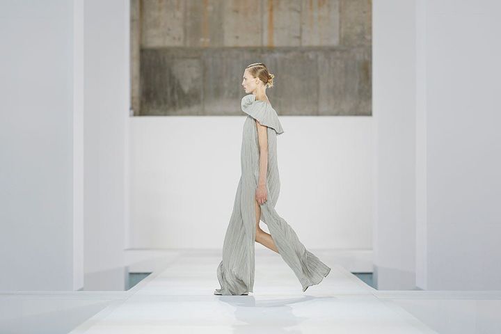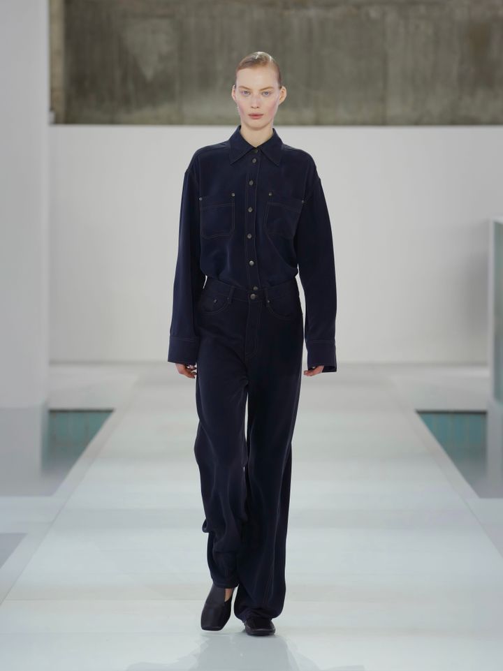 特に視線を集めたのは、アトリエの技術が光るシルクの扱いだ。精緻なプリーツや優雅なドレープは、計算し尽くされたカッティングによって、驚くほどしなやかな動きを実現。中でも、シルクで表現されたトロンプ・ルイユ(だまし絵)のデニム風ルックは、クラフトマンシップと遊び心が同居する、今季を象徴するマスターピースといえる。