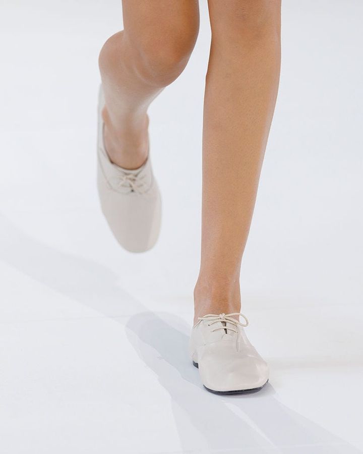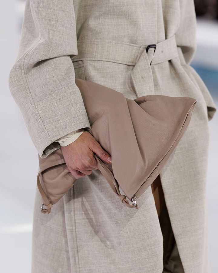1980年代のスタイリングから着想を得たトーン・オン・トーンの着こなしは、異素材の組み合わせによって奥行きを生み出し、都会的でありながらどこかエフォートレスなムードを漂わせる。足元を彩るしなやかなレザーサンダルや軽やかなローファー、くったりとしたやわらかい質感のバッグも、クラシックな装いに心地よいリラックス感を与えていた。
