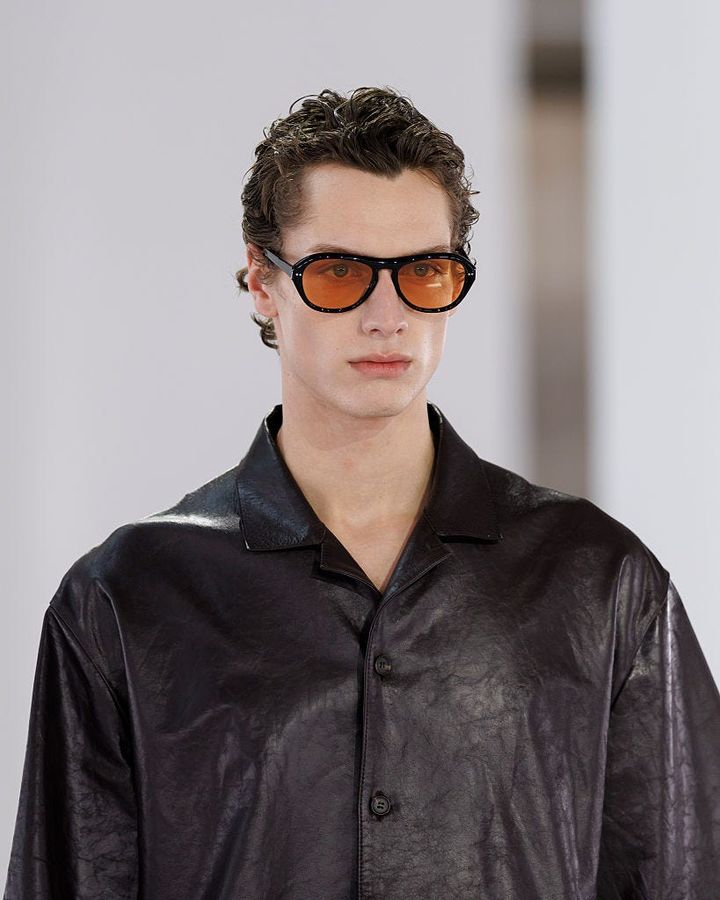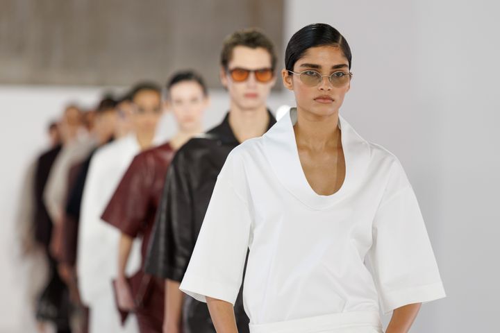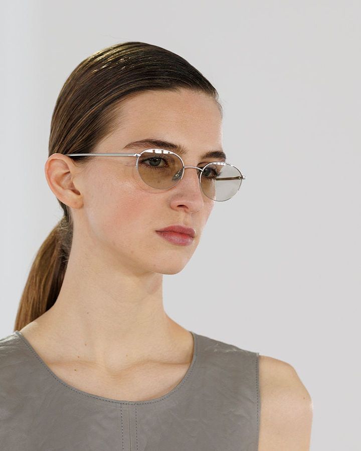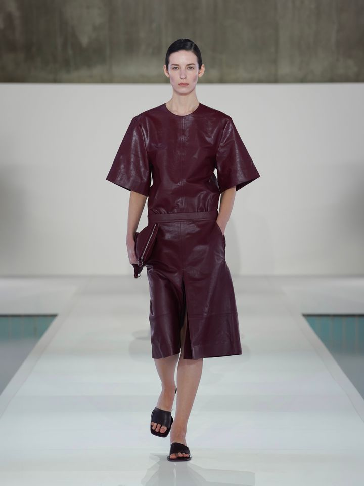 注目すべきは、素材への深い探求だ。レザーやテクニカル素材は、計算されたドレープによって彫刻的なフォルムを浮き彫りにし、動くたびに光を反射する。紙のような質感のしわ加工が表情をもたらし、リネンのメランジがさりげなく深みを添える。体のラインを見せるシアーな質感と、風をはらむエアリーなファブリックには、現代女性にふさわしい軽やかな洗練が宿っていた。