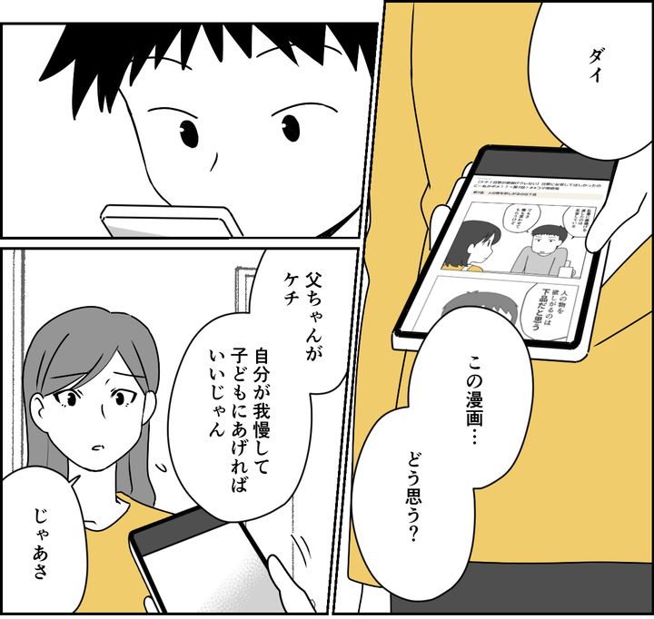 私は帰宅した息子に、漫画を見せました。息子は私と同じく「父親がケチ」だという感想を言いました。そこで私は、漫画に寄せられた読者のコメントを見せます。「あなたがここで言う子どもで、モモちゃんがお父さんの立場」と説明すると、息子の顔はサッと青ざめました。