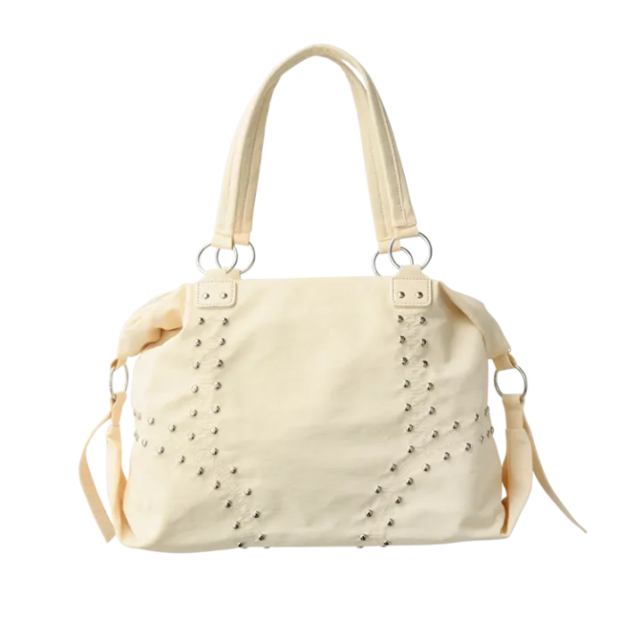 辛口なスタッズデザイン。1泊2日程度の小旅行なら、これひとつで十分。中身が見えないファスナーつきなのもうれしい♡