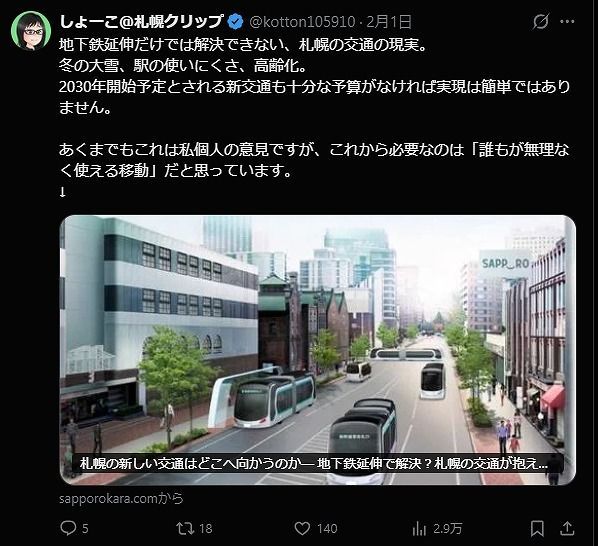 札幌のブロガー・しょーこさんは2月1日、「札幌の新しい交通はどこへ向かうのか― 地下鉄延伸で解決?札幌の交通が抱える本当の課題 ―」と題した記事を出し、SNS「X」にも投稿しました。そこには、生活者としての実感が率直に綴られています。