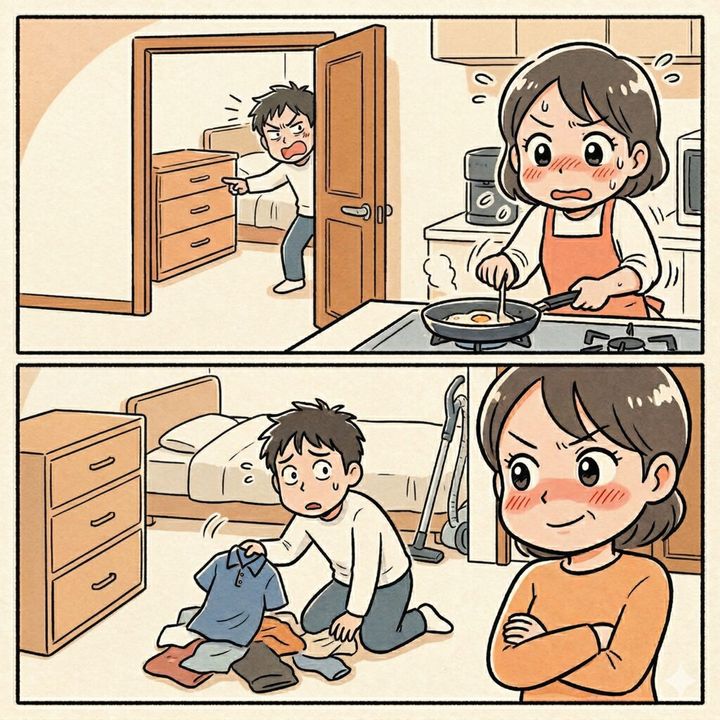 キッチンでお弁当の卵焼きをひっくり返している最中に、寝室から夫のイライラした声が飛んできました。