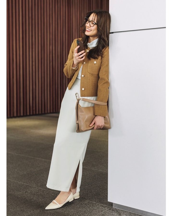 4月8日(水)、ツイードジャケットはコンパクト丈を選べば、今っぽいバランスと上品さを両立できます。アイボリーのロングスカートでIラインを強調すれば、すっきりとしたスタイルアップも叶って。小物もベージュ〜ホワイトでまとめて、やわらかなトーンに統一すると、きちんと感がありながらもどこか優しげな印象な上品コーデに仕上がります。