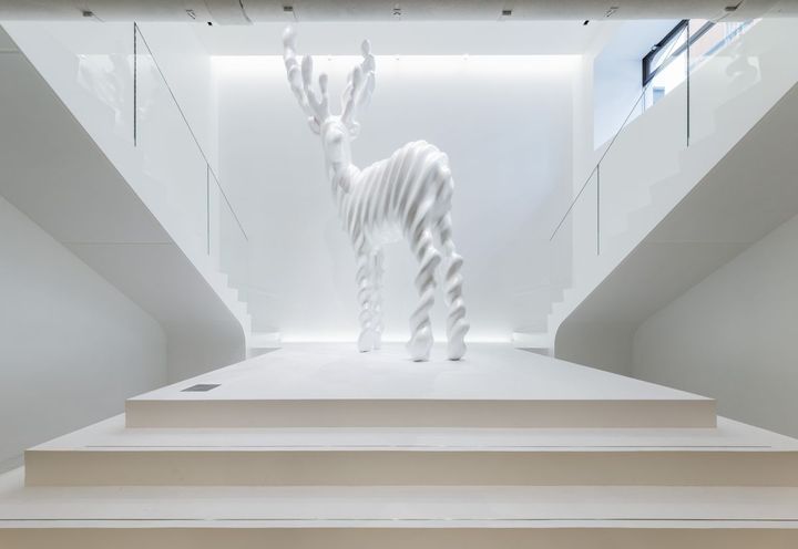 地上1階と地下1階の2フロアは、開放的な吹き抜け構造で、左右対称の階段を採用。吹き抜けには、大阪・関西万博でも注目を集めた彫刻家・名和晃平氏による高さ5メートルの《Snow-Deer》が常設展示されている。