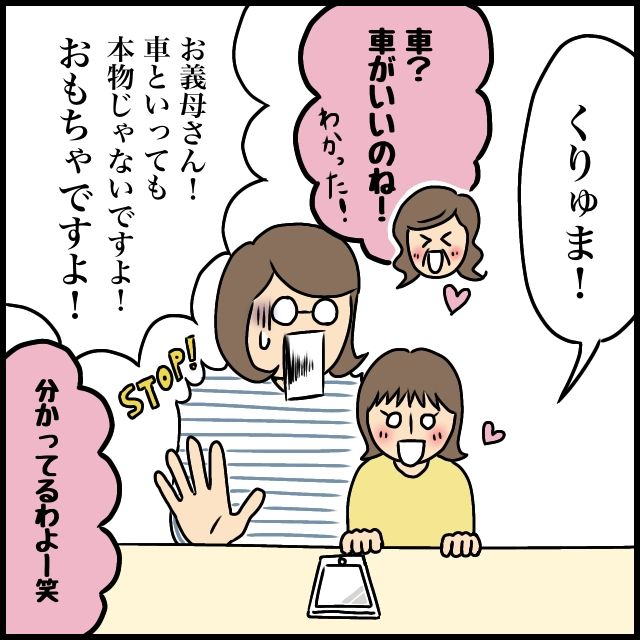 「くりゅま!」とスマホ越しに元気よく答える娘。すると「車?車がいいのね!わかった!」と義母の声が聞こえ、私は慌てて「お義母さん!車といっても本物じゃないですよ!おもちゃですよ!」と訂正。義母ならやりかねないとドキドキしていると、「分かってるわよー笑」と返事があり、ひとまず安心していたのですが・・。