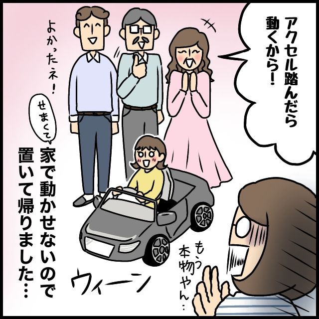 「アクセル踏んだら動くから!」と笑顔で話す義母。夫も「良かったね!」と笑顔で娘を見守るなか、「もう本物やん・・」とつぶやく私。結局、家では動かせないので置いて帰ることにしたのでした。
