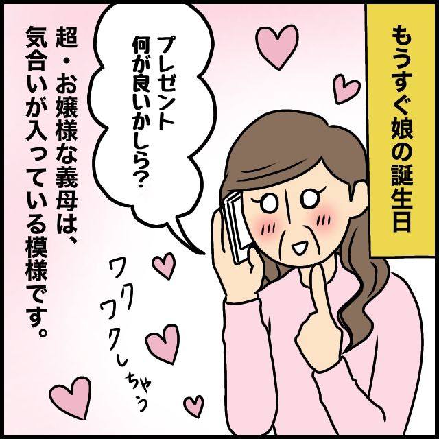 もうすぐ娘の誕生日。「プレゼント何が良いかしら?ワクワクしちゃう」と義母から電話がありました。超お嬢様の義母は娘の誕生日にかなり気合いが入っている模様です。