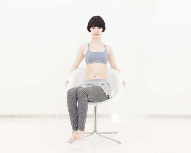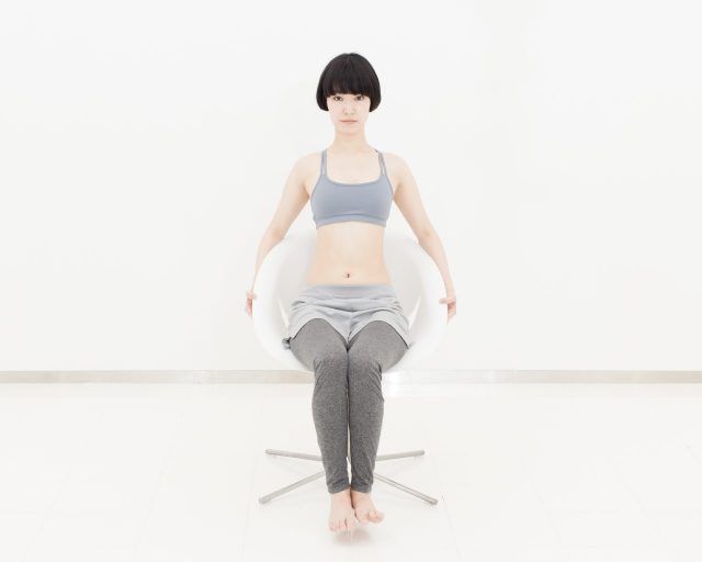椅子に浅く座り、背筋をまっすぐ伸ばします。ひじ掛けを軽く持ちながらバランスを取り、両ひざをそろえて持ち上げ、足の裏を床から5〜10cm浮かせましょう。骨盤を立て、上半身が後ろに倒れない位置をキープします。