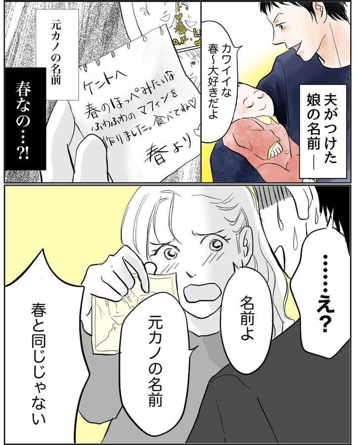 夫から提案された春生まれの女の子にふさわしい名前。絵に描いたような幸せです。しかしその幸せは、この名前の真実に気づくまでのことでした。妻が偶然見つけた夫の元カノからのメモ、そこに書かれた名前が「春」だったのです。