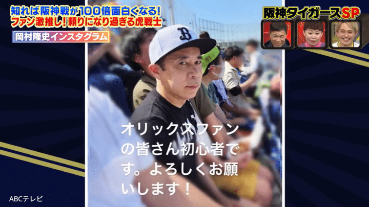 岡村は、約3年前からオリックスのファン。他球団に興味がないのか、阪神ファンが多い大阪出身でありながら、阪神には詳しくない。阪神の現監督が誰かすら曖昧なため、同球団のOB・今成亮太から「関西で生きられなくなりますよ!」とツッコまれてしまった。