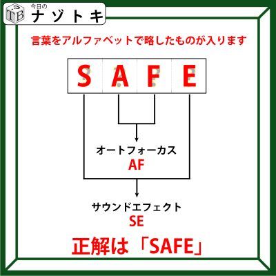 それはそれぞれの単語をアルファベットで略すことです。つまり、「オートフォーカス」なら「AF」と略すことができ、「サウンドエフェクト」なら「SE」と略すことができます。あとは枠に当てはまるようにアルファベットを並べていきましょう。正解は「SAFE」でした。