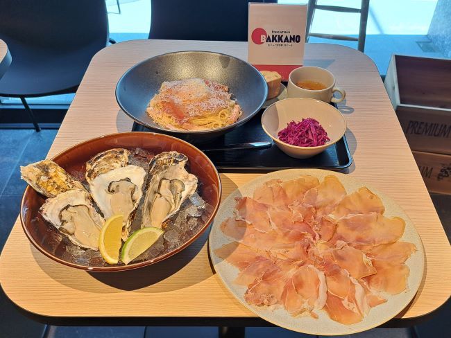 生ハムと半熟卵のカルボナーラ(2,178円・写真下奥)などランチメニューのパスタは、日替わりも入れて8種類。生牡蠣は一年中楽しめ、1個から注文OKです。 店内にある赤い生ハムスライサーの存在感が抜群!