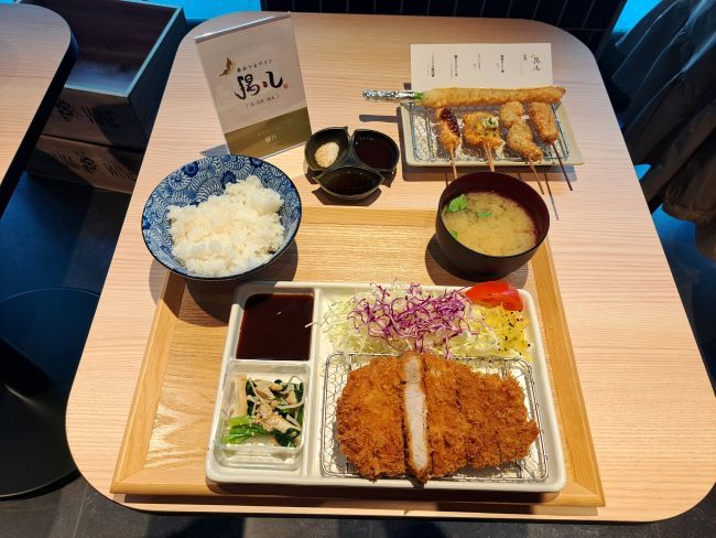 大和ポークのロースカツ定食(1,299円・写真下)、ミックスフライ定食、チキン南蛮定食などランチメニューや串カツ盛り合わせなどのほか、韓国料理のメニューも。軽い口当たりの揚げ物が楽しめます。