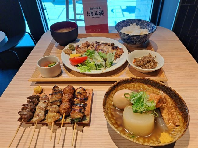 ランチメニューとして炭火焼き鶏もも定食(1,299円・写真下奥)や、7種の野菜と鶏肉の黒酢あんかけ定食などを用意。顎出汁(あごだし)おでんは3種と5種から選べます(写真下は5種749円)。