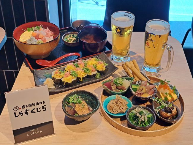 淀屋橋初出店の串カツ専門店「揚八(あげは)」、多彩な鶏料理を提供する「炭火焼き鳥 とり五楼(ごろう)」、クラフトビールやワインとのペアリングが楽しめるイタリアン「生ハムと生牡蠣、生ビール BAKKANO(バッカーノ)」、福岡直送の鮮魚を提供する「博多海鮮角打ち しらすくじら」の4店舗の厨房が、店内中央に集合。各店のランチメニューのほか、単品メニューやビール・ワインなどのお酒、ソフトドリンクが注文できる、一見するとフードコートのような空間です。