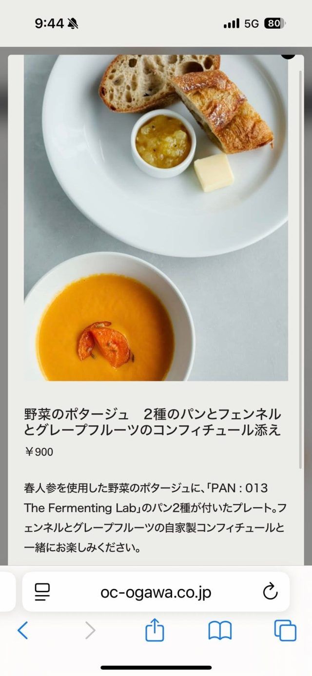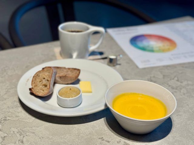 ポタージュは春人参を使用したもの。 パンにはフェンネルとグレープフルーツのコンフィチュールが添えられています。 このコンフィチュール、爽やかな風味でとってもおいしい。 クロワッサンなどの生地に使われているのは京都の地粉だそうです。