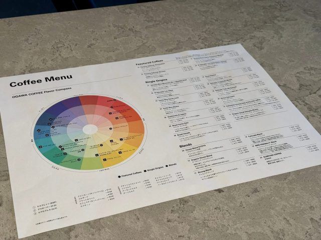 コーヒーはセットのものも選べますが、テーブルに用意されたメニューから選ぶこともできます。 こちらは「すっきり」「しっかり」「さわやか」「まろやか」などの風味がマッピングされたチャートから、好みの豆や、好みの飲み方を選べます。