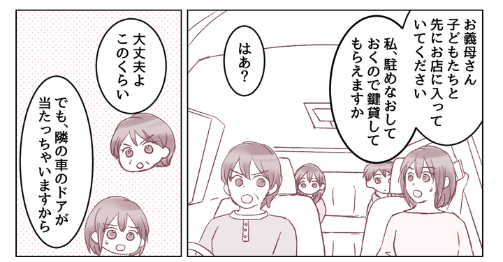 私が義母の車を「駐めなおしておく」と申し出たので、少し気分を害してしまったようです。義母はイラッとした様子で「大丈夫よ、このくらい」と言い返してきました。けれど隣の車にも迷惑だし、ドアが当たって傷でもつけたら大変です。