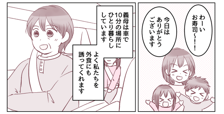 義母は明るくチャキチャキした性格で、出かけるのが大好き。その日は私たちを回転寿司に誘ってくれました。しかし義母が駐車したところで、私は異変に気付きます。どう見ても車が地面の枠に対して斜めになっているのです。