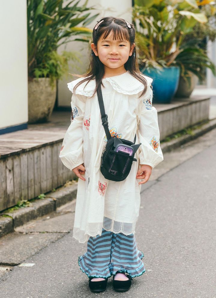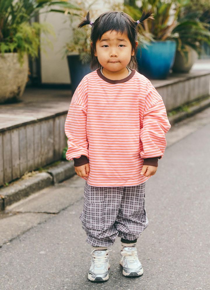 オーバーサイズがこなれ感あるキッズコーデ。柄オン柄の組み合わせも春カラーで揃えることで、まとまり見えが叶う。