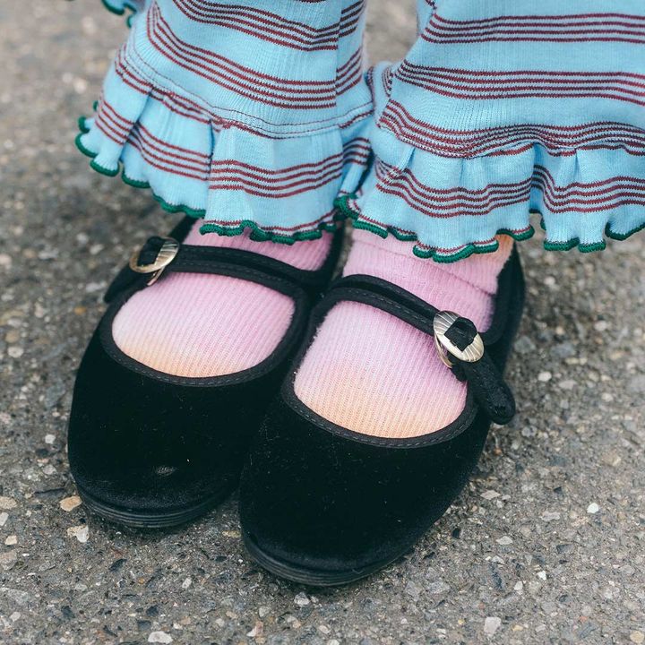 『ラ カデナ』のベロアシューズで、ワンピースのガーリームードをシェア。シルバーのバックルやすっきりとしたフォルムなど、行き届いたデザインが魅力な一足。