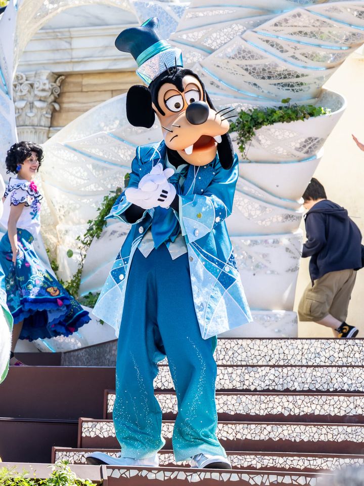 グーフィーもミッキーマウスたちと同様に、25周年の特別な衣装を身にまとって登場。