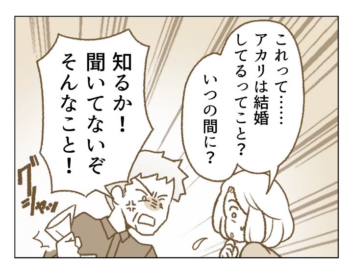 アカリさんの戸籍が二度と自分たちの元に戻ることはない……。その事実に対して、少なからず思うところがあるミサトさん。一方でヒデキさんはそんなことはおかまいなしに、アカリさんの居場所を突き止めようと必死です。その姿は、愛情というよりは執拗な執着のように感じてしまいます。そうして戸籍の附票を取り寄せたお2人は、驚愕の事実を突きつけられます。なんとアカリさんは結婚しているようなのです……。