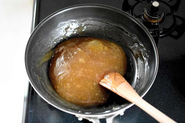 2. フライパンにAを入れてよく混ぜ、弱めの中火にかける。 絶えず混ぜ続け、透明になって生地がまとまってきたら、 さらに1分ほどよく混ぜる。