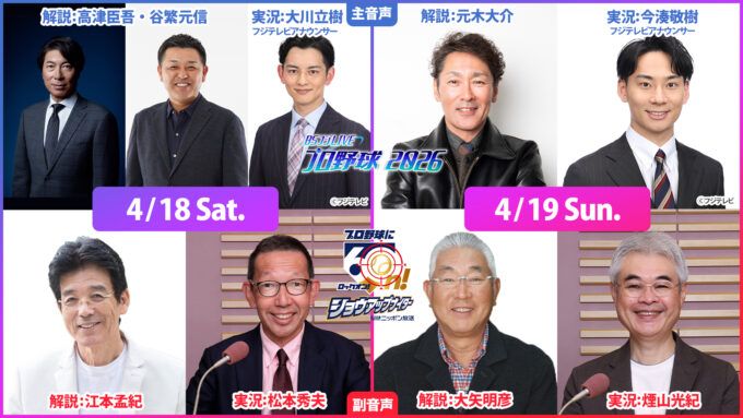 4月18日(土)、19日(日)の「ヤクルト×巨人」戦にて、今年放送開始60周年のニッポン放送のプロ野球中継『ニッポン放送ショウアップナイター』とBSフジのプロ野球中継『BSフジLIVE プロ野球2026』がコラボ放送を実施。『ニッポン放送ショウアップナイター』の実況音声が『BSフジLIVE プロ野球2026』の副音声で放送されることが決定した。
