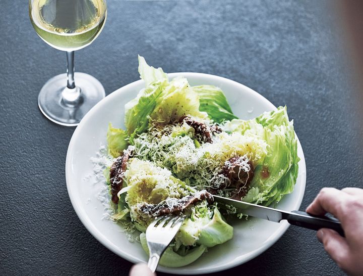 シンプルな調理法で提案する、小串シェフ直伝のシーザーサラダ。ナイフとフォークで豪快に切り分けながら食べることで、レタスのフレッシュな歯触りと甘みを存分に味わえる。レタスの水分が出る前に食べるのが、おいしさをキープするコツ!
