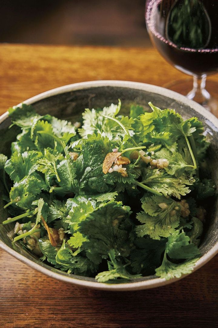 東京・新橋のフレンチ「マルディグラ」の「香菜の爆弾」は、人気メニューのひとつ。パクチーの苦味に、ほんのり甘いドレッシングが重なり、奥行きのある味わいに。にんにくチップスの辛みや香ばしさがアクセントになり、もりもり食べ進めてしまう、やみつきの一皿だ。