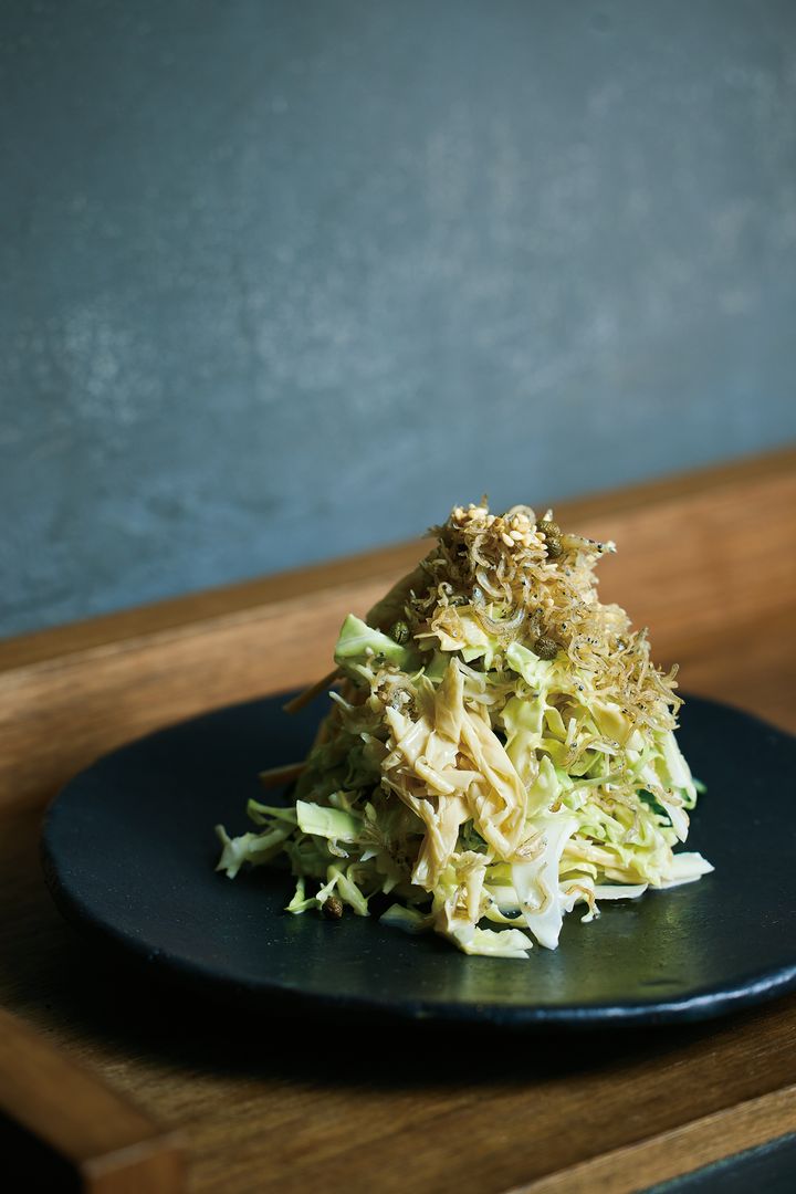 酒井シェフ直伝の和風コールスローは、和の素材を組み合わせることで、品のある風味が生まれ、うま味と香りの豊かさが際立つ。だしを含んだ湯葉のやさしいうま味に、山椒の爽やかな香り、ちりめんじゃこの程良い塩気が重なり、最後まで飽きずに楽しめる。