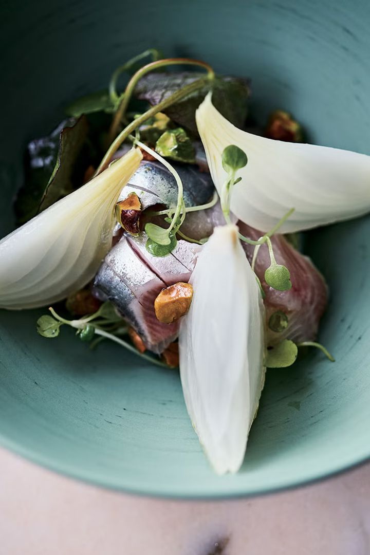 甘みとジューシーさが魅力の新玉ねぎを、かつおだしで煮込んで。丸山シェフが提案するのは、素材の魅力を引き出したピクルスサラダ。ツンとしないやわらかな酸味と、だしが染み込んだ新玉ねぎがいわしとよく合う。
