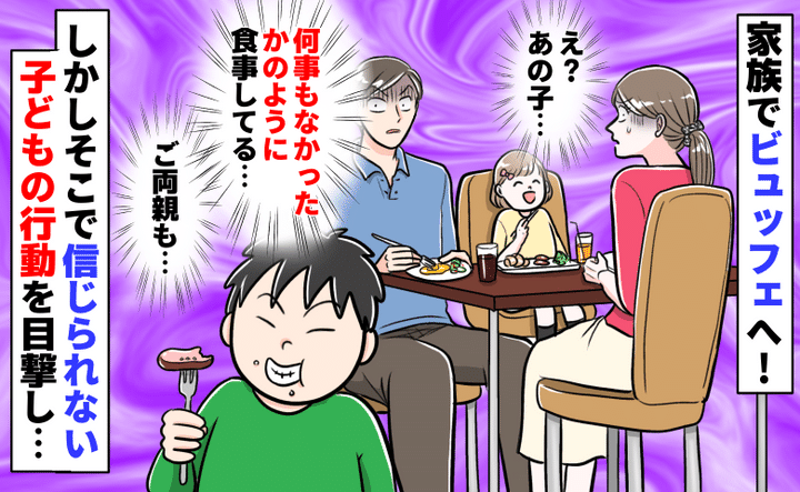 当時6歳だった子どもを連れて、ビュッフェへ行ったときの話です。家族で食事を楽しんでいたところ、近くのテーブルにいた親子の行動に驚きました……。