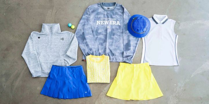 <下段左から>プリーツスカート¥15,400(アディダスゴルフ/アディダス ゴルフお客様窓口)モノグラム柄のニット¥33,000(ヒールクリーク/グリップインターナショナル)スカート¥13,200(ピンアパレル/TSIお客様相談室)