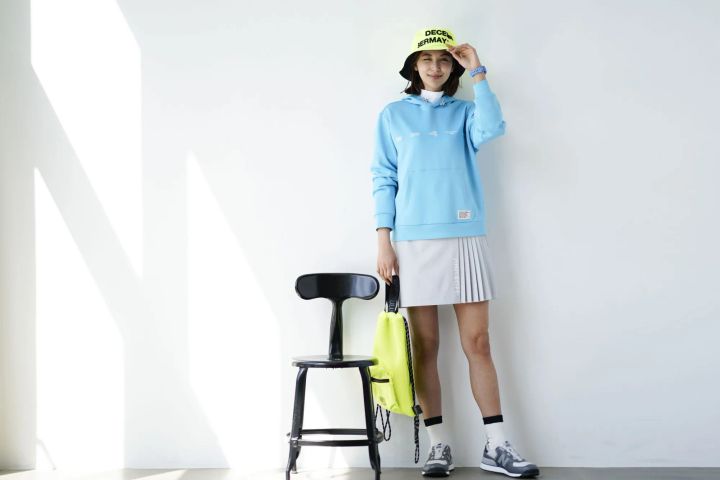 さまざまな色を受け止めるフレッシュなライトグレーですが、今季は、久々に着たくなっているネオンイエローと水色を組み合わせると新鮮です。アスリートな気分の日にぴったりの明るくヘルシーな配色で、好感度も抜群。ライトグレーのミニスカートは多彩な着こなしを可能にする万能アイテム。部分プリーツのすっきりとしたデザインは動きやすさも。スカートとシューズ、帽子とバッグ、それぞれの色をリンクさせ、全身で使う色はMAX3色に抑えるのがセンスアップの秘訣。