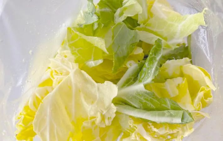 春キャベツを食べやすい大きさにちぎって、耐熱ポリ袋に入れます。