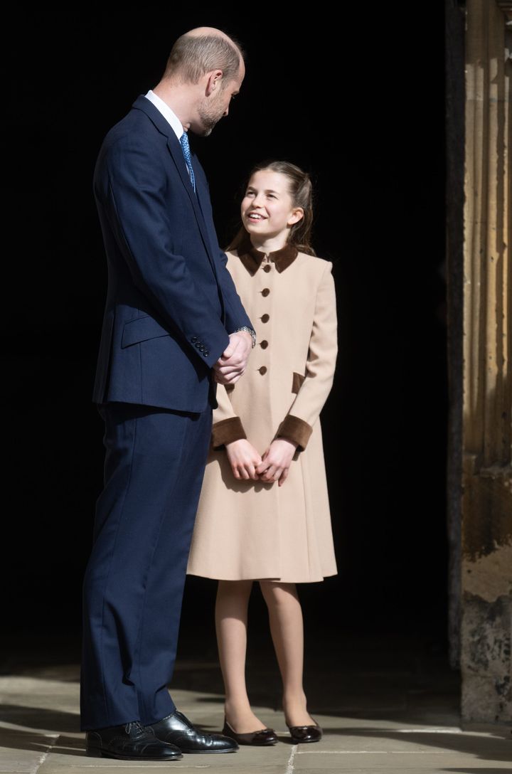 聖ジョージ礼拝堂の入り口にて、チャールズ国王夫妻の到着を静かに待つロイヤルメンバーたち。伝統的なプロトコルに則り、最後に入場する国王を出迎えることになっている。これは、父を見上げて笑みを向けるシャーロット王女とそれに応えるウィリアム皇太子の微笑ましい父娘ショットだ。