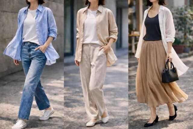 今季はシャツを“トップス”ではなく“軽いアウター”として使うのもポイント。ボタンを閉じて着るよりも、さらっと羽織るほうが、自然な動きと抜けが生まれます。