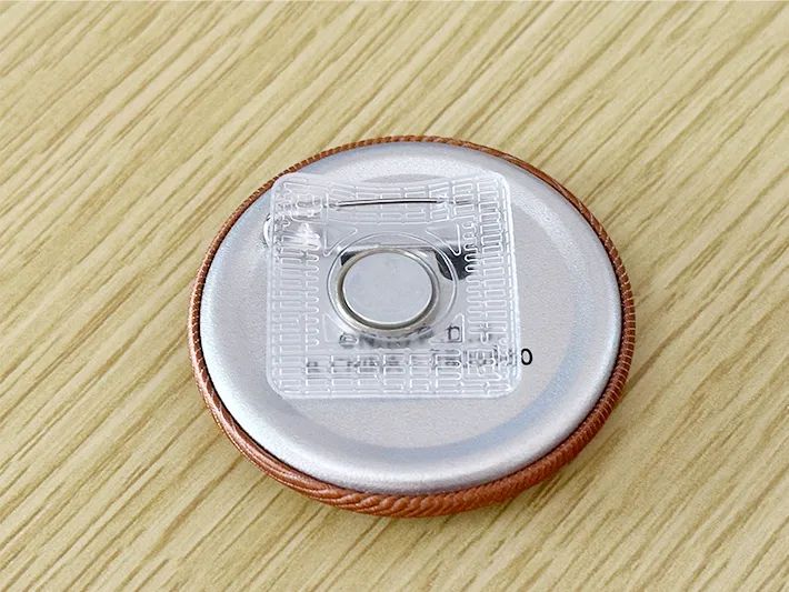 マグネットを1つだけ手にし、つけたい缶バッチやブローチを表面のビニール部分に刺して固定します。
