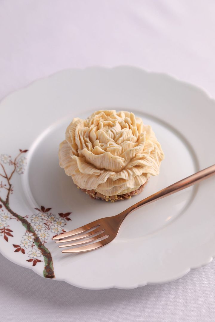 写真はシグネチャーケーキのひとつ「マダガスカル産バニラとピーカンナッツのフラワーケーキ」。芳醇なバニラムースとコク深いクリームの下層には、ピーカンナッツのキャラメリゼやフルール・ド・セルを効かせたクルスティヤンを忍ばせて。なめらかな口どけの中に、ナッツの食感がいい。