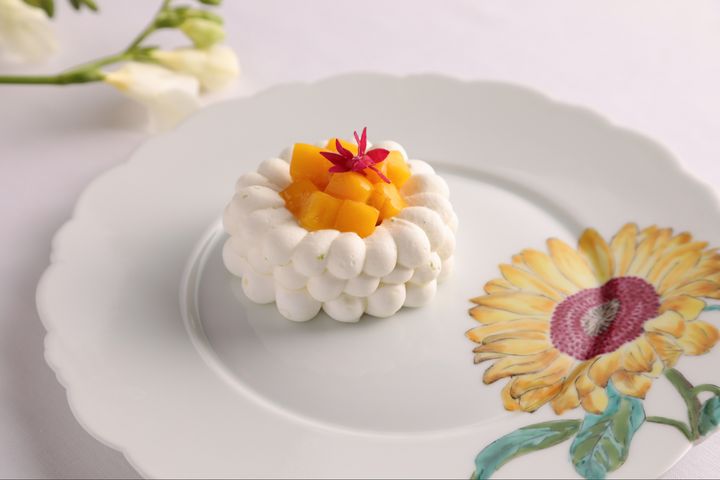 「エキゾチックフルーツのパブロバ」はサクふわ食感のメレンゲで仕立てた軽やかなデザート。ライムでマリネしたマンゴーの果⾁がみずみずしいアクセントとして効いている。