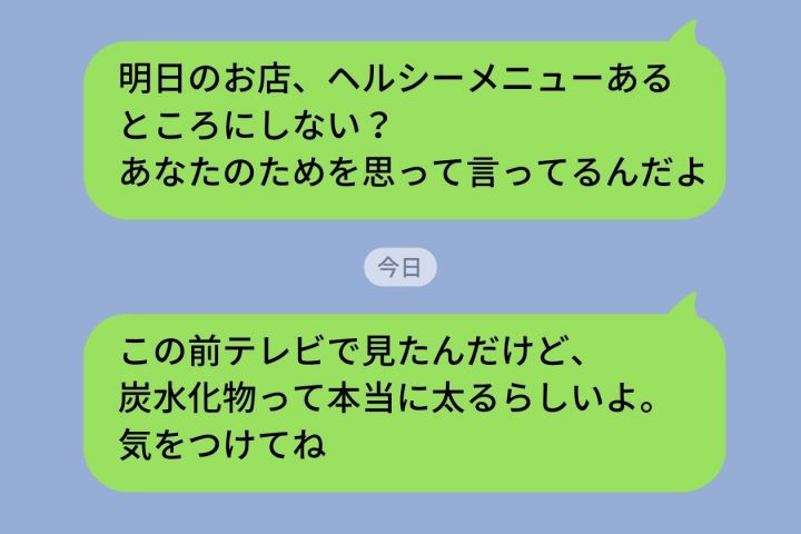 約束をした後に「明日のお店、ヘルシーメニューあるところにしない?あなたのためを思って言ってるんだよ」とメッセージを送り、数日後には「この前テレビで見たんだけど、炭水化物って本当に太るらしいよ。気をつけてね」とも伝えました。「あなたのために言っている」という気持ちに、一切の迷いはありませんでした。